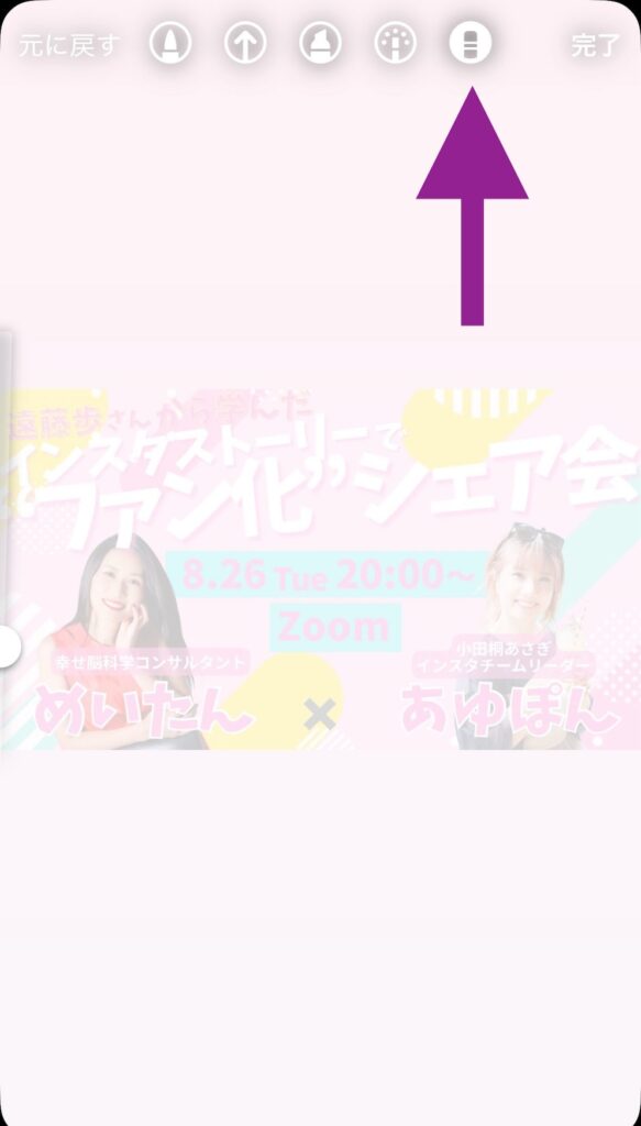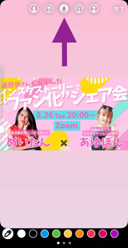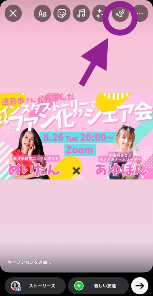 この紫で丸をした絵がででない場合は、その隣の3つの点を押すと「落書き」と書いた文字が出てくると思います!